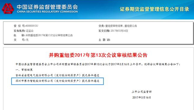 3月16日晚,证监会发布公告,证监会并购重组委第13次会议于3月16日上午召开,根据审核结果,必一体育·(中国)官方网站智能(300044)发行股份购买资产获无条件通过。